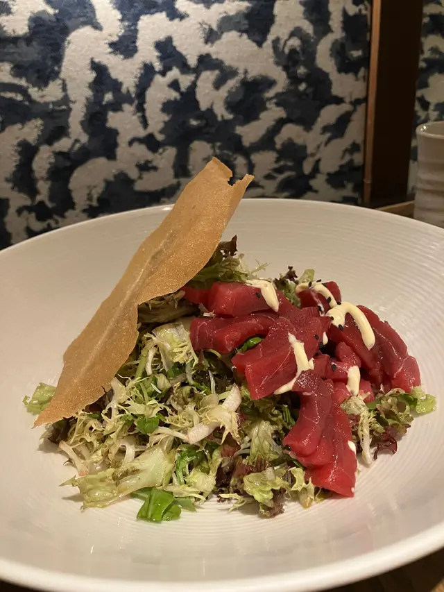 超開胃的沙律!新鮮的沙律菜混滿了酸酸甜甜的沙律汁,再配上脆片跟金槍魚片,很清新的開胃菜