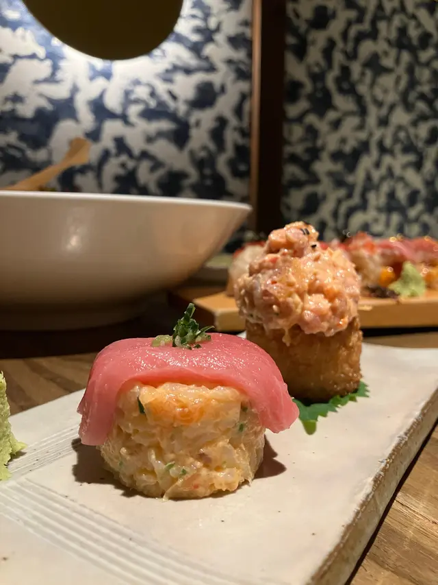這個很特別的配搭,一邊是帶點辣味的壽司配上一片金槍魚魚生,而另一邊則是炸到外脆內軟的壽司飯搭配香辣的金槍魚肉!
