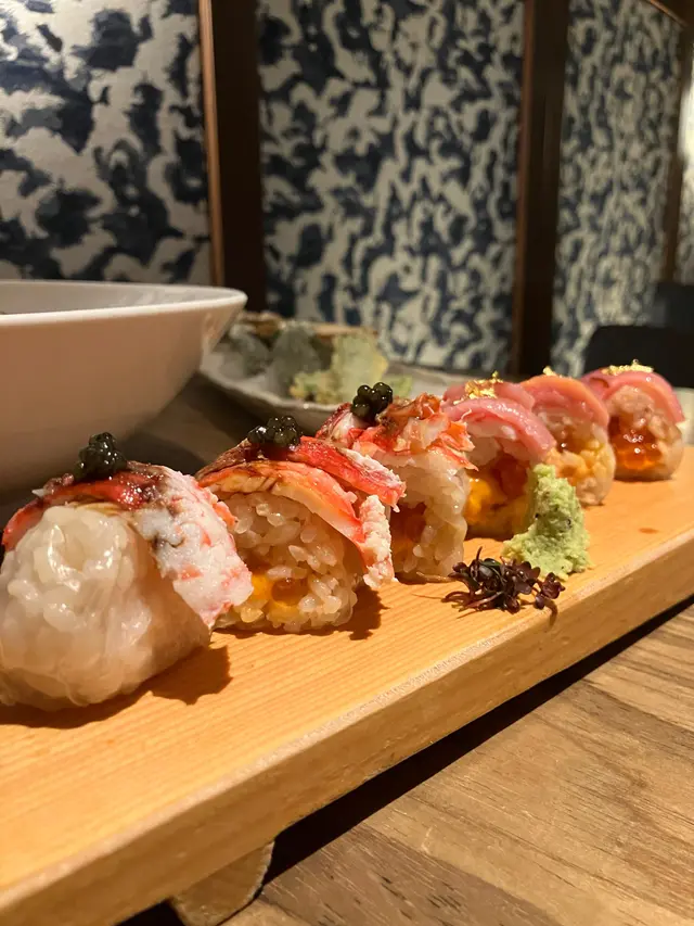 很大膽創新的一款壽司!以越南米紙來代替紫菜,將壽司飯鋪在上面,中間加入海膽、三文魚籽,捲起來再在外面鋪上金槍魚魚生跟蟹肉。口感特別味道很不錯