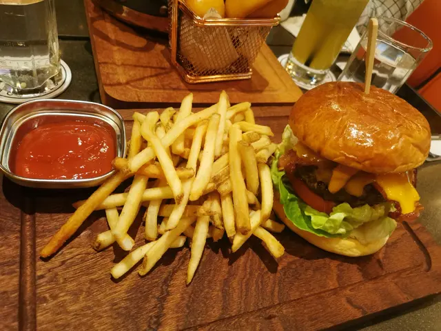 我哋仲叫咗個非常邪惡嘅漢堡包, 配埋啱啱炸起嘅薯條。 嗰塊牛肉扒好多汁, 一咬落去啲汁漏曬出嚟
