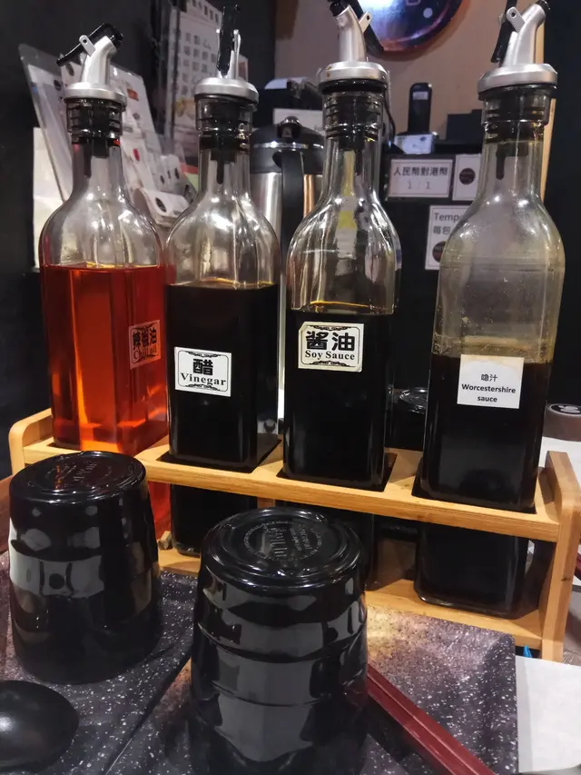 每張枱上都有各式調味料。