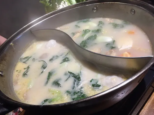 叫左個招牌螺片濃雞湯鍋,加$10有雙拼湯底,所以加左招牌鮮魚湯鍋。一來即刻倒碗湯飲先,湯煮到奶白色,好鮮味,好好飲。