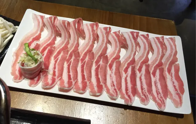 豬腩肉一睇就知肉質好新鮮好靚,雪花條紋分明,厚薄適中,果然肉味香濃,好好食。