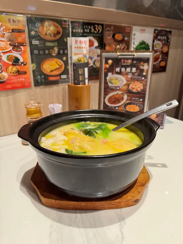 奶白色嘅湯,入面收藏住幾粒大雲吞,仲有好大舊雞,啲小棠菜都煮到入晒味