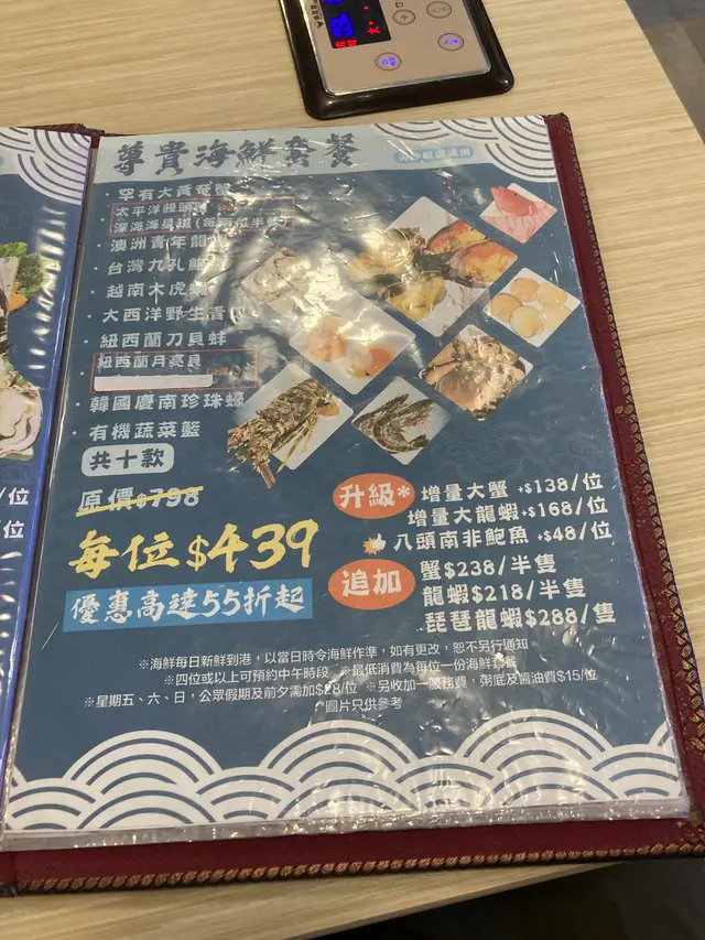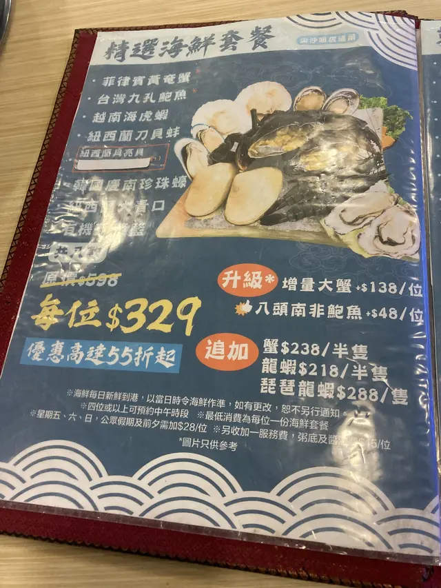 我哋選擇叫$438嘅尊貴海鮮套餐,套餐都好多款唔同嘅海鮮,饅頭蟹、龍蝦、奄仔蟹、虎蝦、月亮貝、鮑魚、青口等