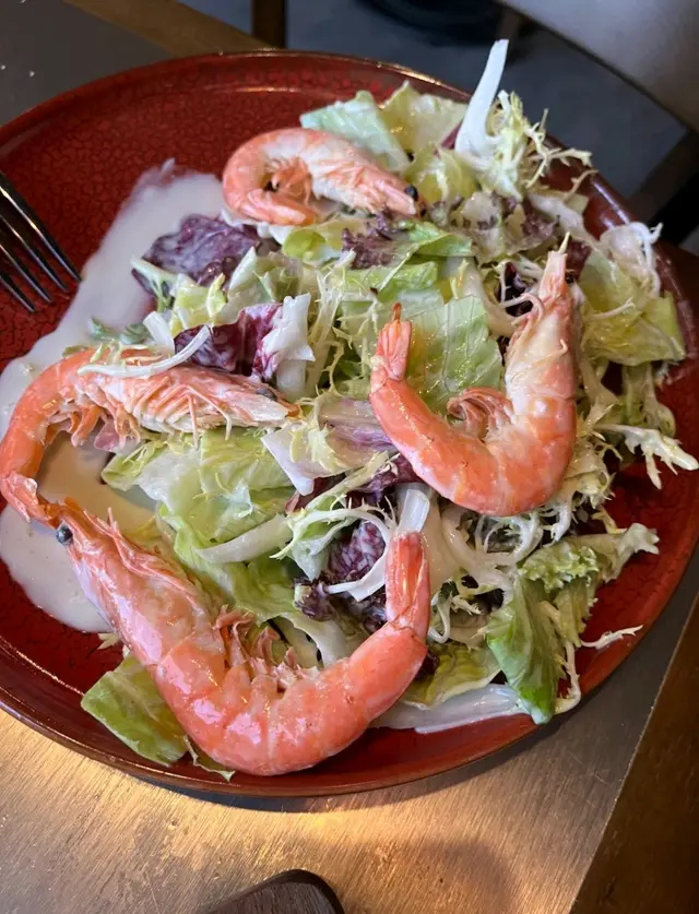 藍芝士沙律,最後先到,其實已經食到好飽,所以都只係食晒啲蝦🙈蝦需要自己剝殼,有四隻大大隻,爽口彈牙,可以解返之前啲切牛扒意粉飽足感,正。