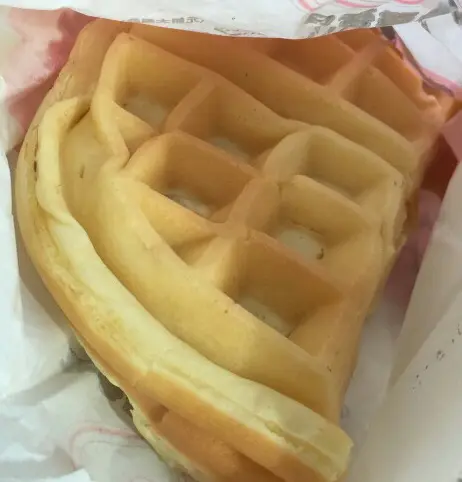 格子餅都好多人買,餅身喺一格格嘅,所以叫格仔餅。皮烘得淡啡色,幾厚身,質感鬆軟,好香嘅蛋味,內面有花生醬。雞蛋仔就食得多,格子餅第一次食,都幾好食喎。