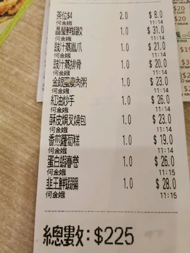 兩個人食咗9 個點心,人均一百多啲。抵食呀,茶錢仲要收四蚊。