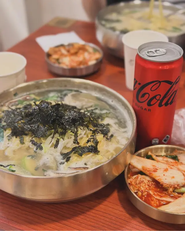 先呷一口湯,有花蛤的鮮甜與蒜蓉香味,咸淡適中,如果想濃一點,旁邊有鹽、胡椒、蔥花、辣椒醬隨便選擇。麵條是黃色曲身闊麵,有少少鹼水味,有別於以往在韓國吃的白麵條,不過就多了份彈牙和不易變腍。