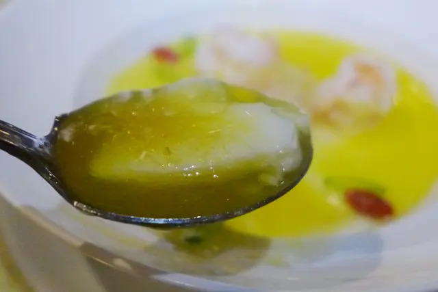 碧綠色的菜苗浸在米白色的湯內,上面再放上幾粒杞子作點綴,簡單得來已經令色彩形成強烈的對比。