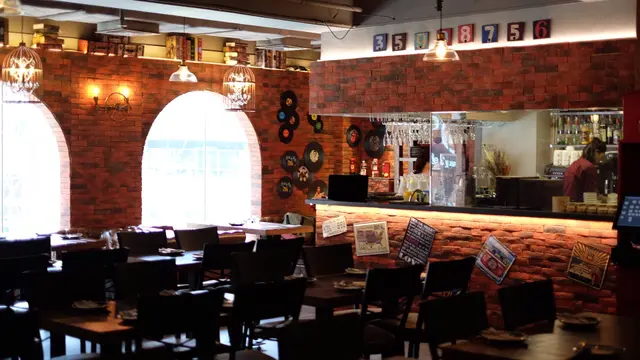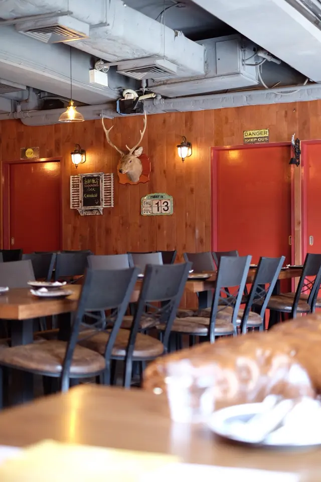 餐廳內的裝修細節以至擺設都別具匠心。紅色文化石牆上裝上一排銅水管,上面亮著幾顆鎢絲燈泡,是個典型的LOFT風格。
