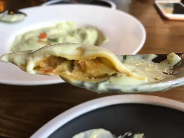 將意大利雲吞對切,見到偏黃色的餡料和點點紅。我將半件雲吞放進口中,最出眾是淡淡Mozzarella 芝士味道,蕃茄味道比較含蓄。配上香草忌廉醬汁,的確豐富了味道層次。不過較早前的香草麵包香氣太突出,此時醬汁的香草味只能亦只應該作點綴作用。而對小弟而言,香草忌廉汁亦太慷慨,反而令忌廉味道有點霸道。