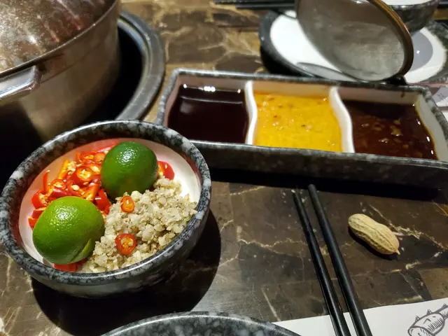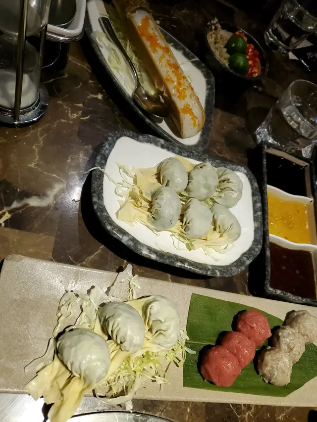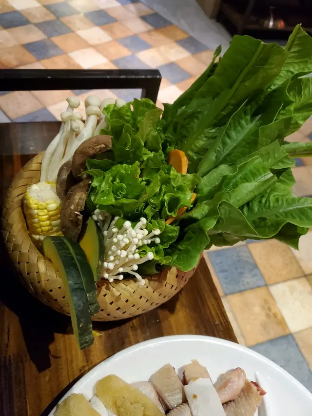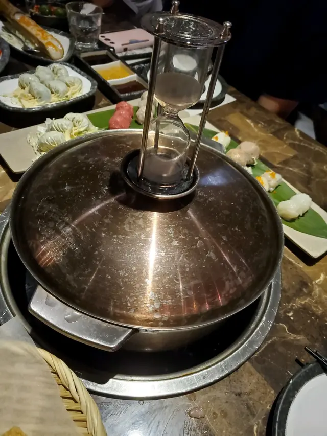 朋友生日選了這間店試下,經openrice訂位好方便,過馬路就見到好大個招牌,推門要上樓梯,上到去見到有紅色電話亭,有好多書和有張sofa,裝修好有文青風格,有影相打卡位。我哋一行6個女仔唔算大胃王,睇餐牌有海鮮套餐或其它套餐好似都幾抵食,但有朋友唔食海鮮咁就散點,點了...竹笙椰子雞一隻$268,手切安格斯牛頸脊$288,野菜藍$68,紫菜響鈴$48, 韭菜餃$78,手打墨魚滑$88,手打丸拼盤$128,臘味芋頭煲仔飯(大煲)$128,醬料每位$15 另加一服務費。好開動啦...先煲滾個椰子湯跟住放碟雞,加上蓋後就放個沙漏計時器在煲蓋上,沙漏完了雞就食得, 先飲下頭啖湯先,湯底好青甜椰子味,食完雞就開始食其他食物,