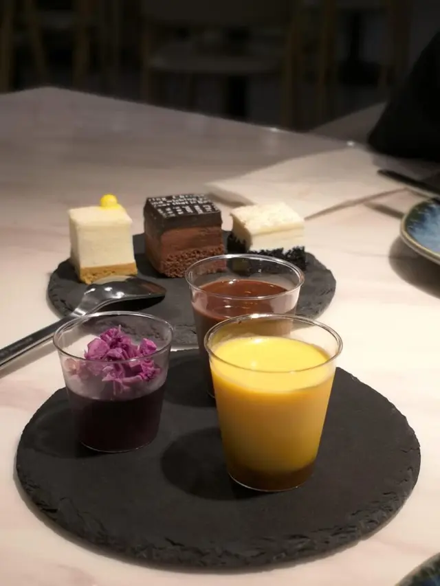我哋點了三色甜品迷你杯, 有朱古力mousse, 焦糖布丁, 紫薯mousse, 甜度啱啱好, 分量細細哋, 淺嚐嚟講, 令我哋可以試到唔同嘅甜品, 十分之有心思