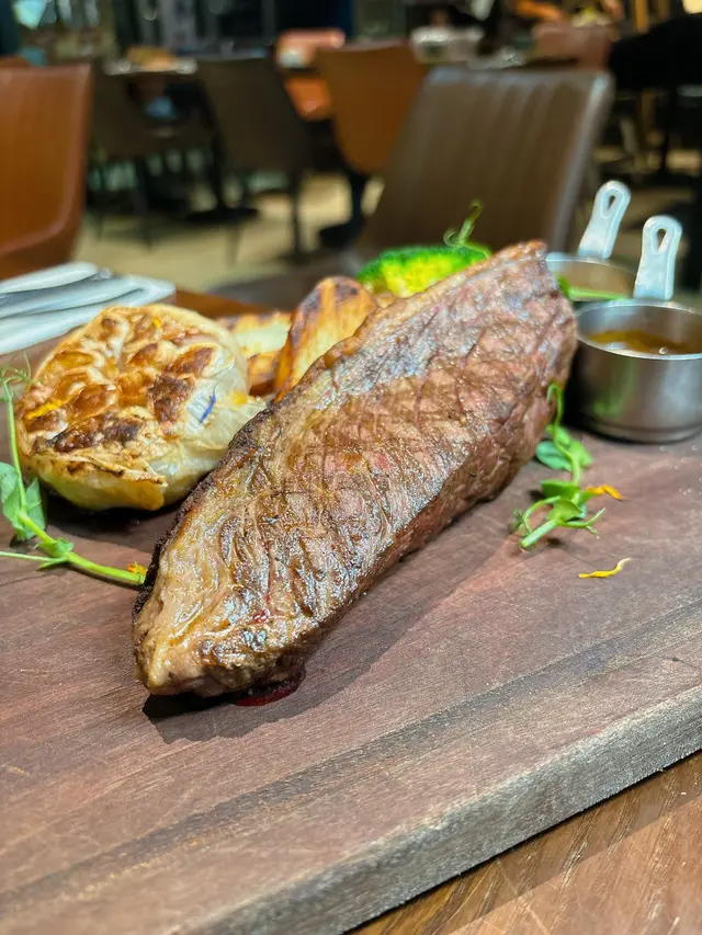 主菜嚟啦!呢塊12安士嘅西冷扒份量十足,我哋叫咗五成熟,切開見到入面係完美嘅粉紅色,肉汁即刻湧出嚟。牛扒表面烤到有微微嘅焦香,食落牛味濃郁,肉質嫩滑得嚟又有啲嚼口,唔會覺得韌。簡單用海鹽同黑椒調味已經好夠,每一啖都係滿滿嘅肉感,非常滿足。🥩