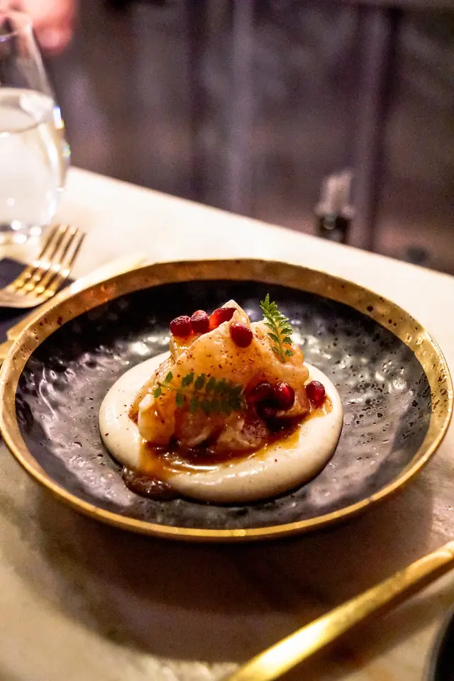 呢日係帶子刺身配椰菜花purée 仲有啲石榴粒