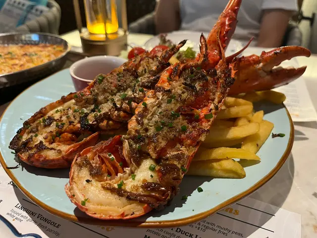 ✨️主菜龍蝦是450-500g,今次膏不算多,但都算大隻,龍蝦鉗大大隻又淡淡肉,香脆薯條和沙律。聞落去烤得好香🤭不過如果多膏啲就完美。我上網也看到其他網友吃過分享過的食評也是多膏。