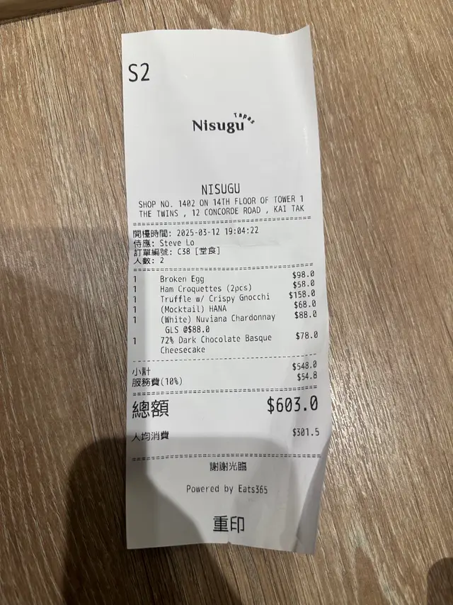 餐前小食選擇多,心大心細,最後選了店員推薦的Broken Egg 再加朋友喜歡的Ham Croquettes 以配搭飲品,主菜選了個人很喜歡的Gnocchi 。甜品以72% Dark Chocolate Basque Cheesecake 結尾。