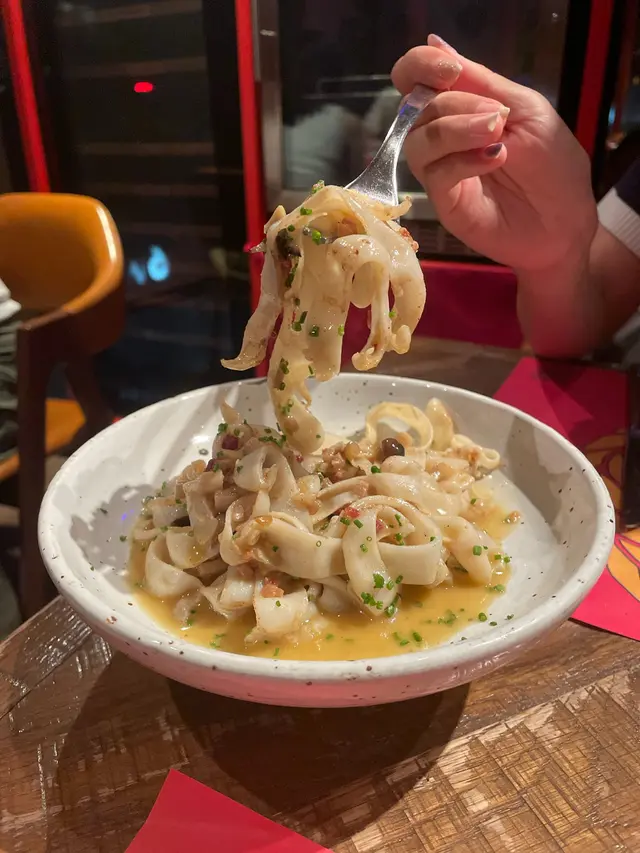 以為係普通嘅卡邦尼意粉配墨魚,但原來係用墨魚整成嘅扁麵!