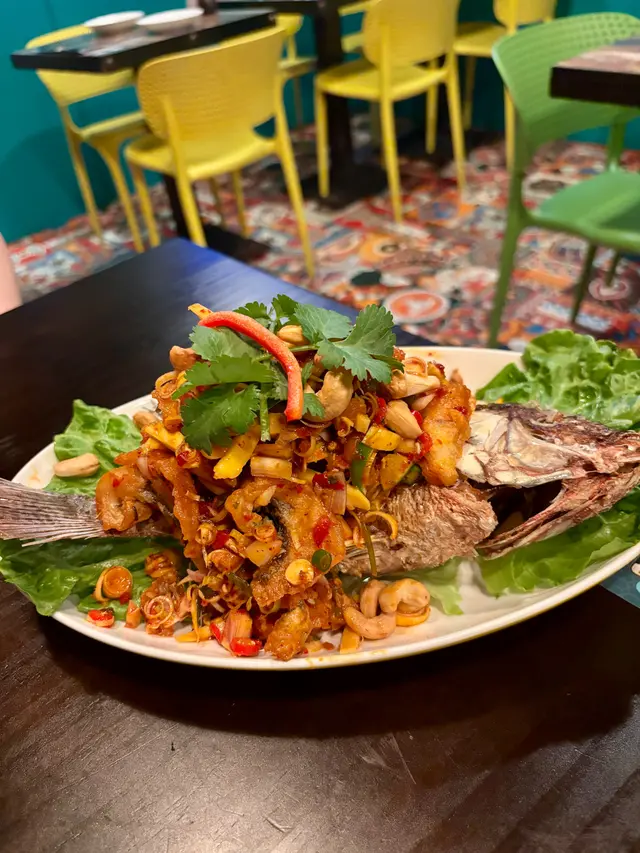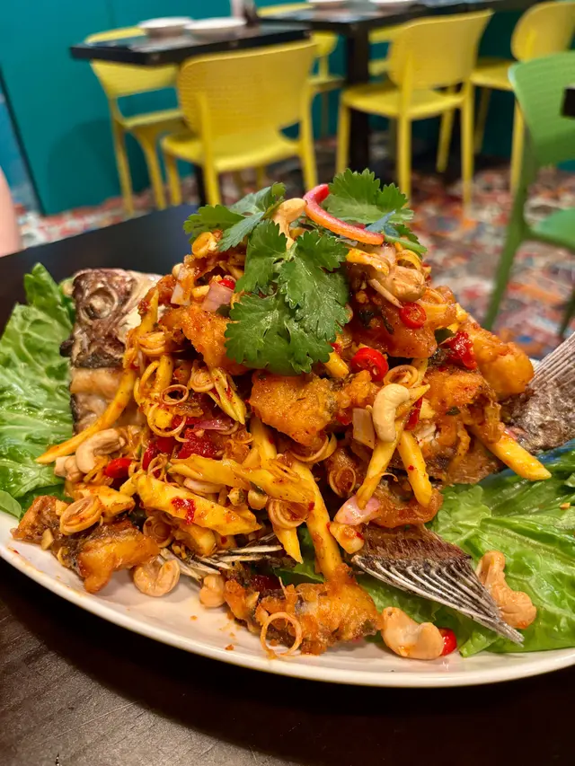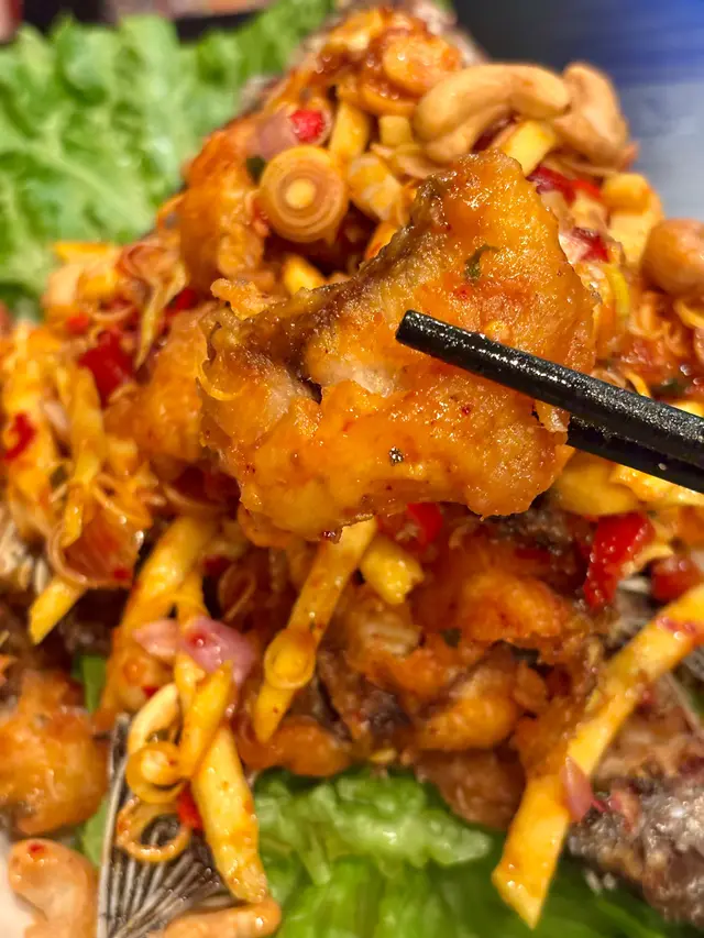 賣相吸引,原條鰂魚,魚肉起塊炸得金黃香脆。上面鋪滿清新爽口嘅芒果沙律,有芒果絲、腰果、洋蔥、青檸、老薑粒同香茅,酸甜開胃,香氣層次豐富。呢道菜色香味俱全,最啱一家人分嚐,邊食邊傾偈,好有氣氛。