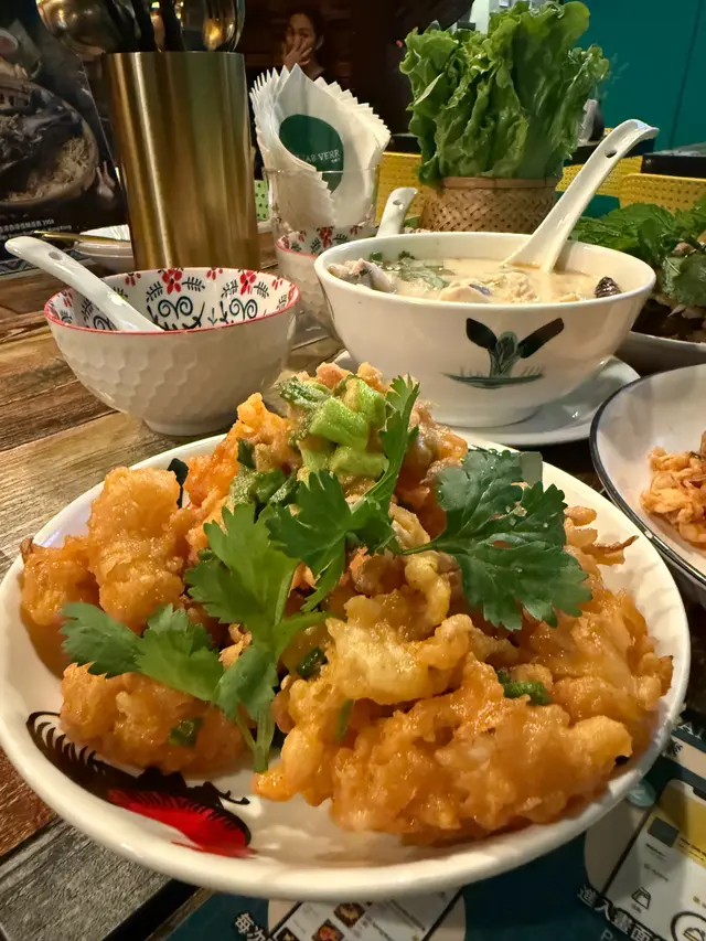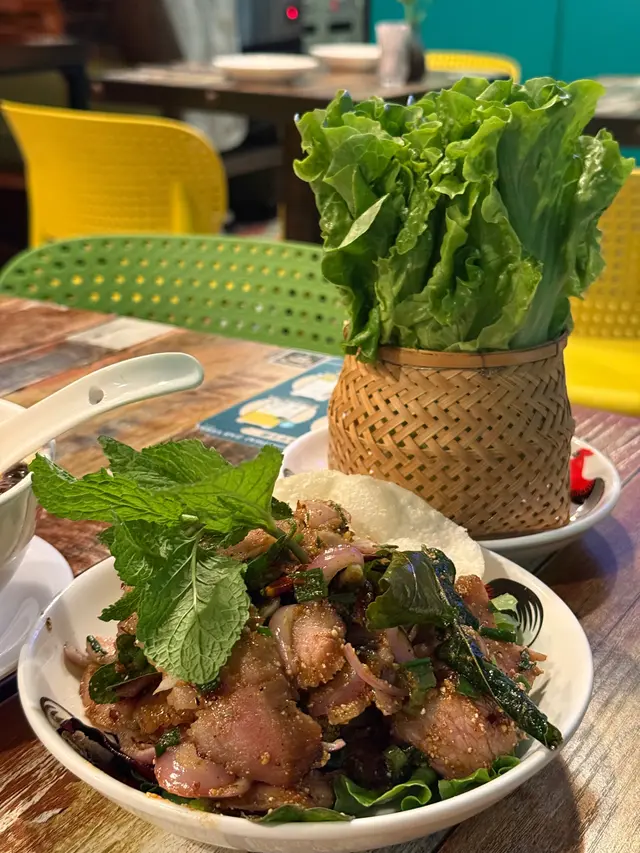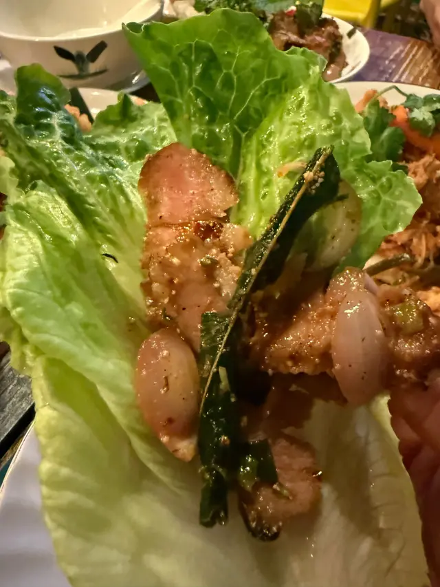 大量生菜🥬,用一個好靚嘅籃仔🧺裝住,豬頸肉爽口,微辣,配埋生紫洋葱及酸酸甜甜的辣汁,用生菜夾住嚟食,好有風味,超開胃😋