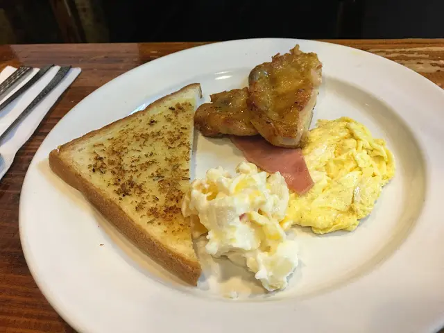 老公點了個歐陸早餐, 蒜蓉多士幾有HEART, 夠脆夠香蒜味, 火腿蛋正常, 沙律幾好丫, 係鮮果沙津, 但塊雞扒就.... 半塊都唔知有無, 會唔會少左D呢?