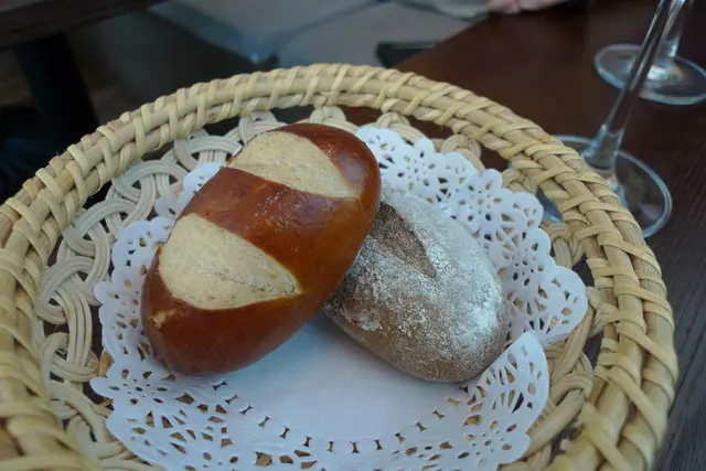 先來一客麵包送白酒, 兩件小貨色, 烘得熱, 有誠意, 其中一隻麵包, 類似德國Pretzel的品種, 但做得比較軟淋, 應為了適應香港人口味吧. 另一款麥包, 皮少少脆, 內裡也十分軟熟.
