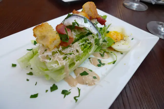 凱撒沙律... 肯定是全世界最受歡迎的沙律, 愈來愈多人知道, 凱撒沙律與凱撒大帝無甚關係, 而只是一位住在墨西哥的意大利人 Caesar Cardini 在1920年發明出來, 至於..如何由墨西哥傳到歐洲...甚至全世界, 則要再查一查.... 世上沒有所謂..正宗的凱撒沙律, 而重點羅馬菜和它的醬汁, 最緊要是微酸少鹹又少少辣, 這碟凱撒沙律的羅馬菜是整塊上碟, 好有氣勢.