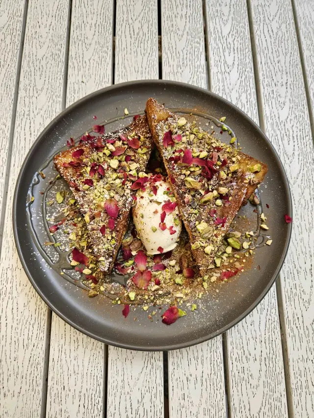 賣相非常非常靚😍吐司上面灑滿紅紅綠綠嘅開心果碎+玫瑰花瓣🌹吐司外脆內軟,口感軟彈,充滿淡淡嘅牛油香味,再配上香甜蜜糖,超好食😋