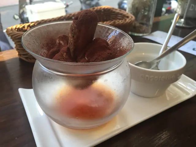 另外再點了tiramisu, 五十幾蚊, 比起個main or lunch set 呢個dessert有D貴. 不過都幾好食. 好滑嘅cheese 入面插了一條soak滿了rum的手指餅~ 加埋灑上面的咖啡粉, 味道好濃郁好到位. 而且佢有兩層, 下層仲有咖啡jelly, 夾埋一齊食唔會覺得好滯.