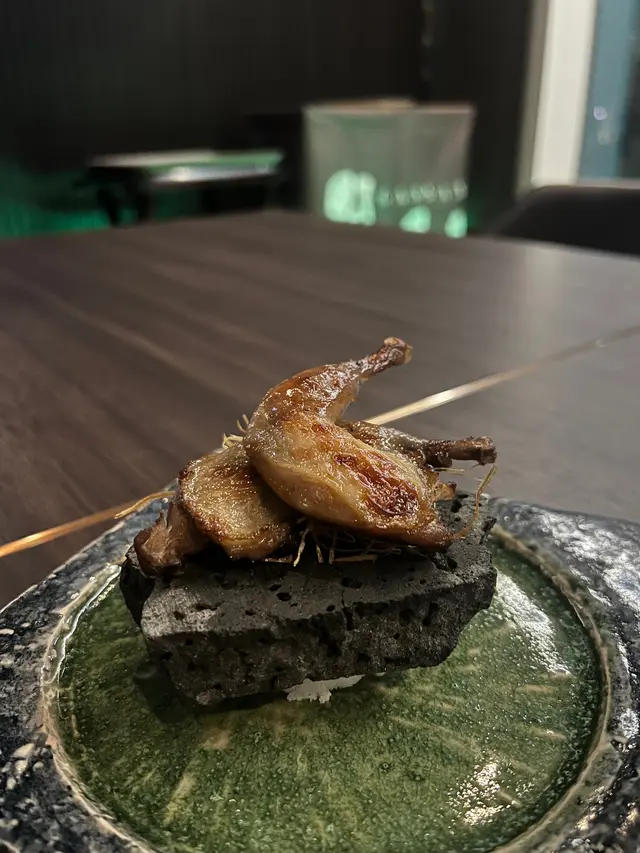 慢煮法國鵪鶉 - 使用6個月大鵪鶉,前一晚用秘製醬汁浸一晚再風乾,然後慢煮45-60分鐘,再石燒 配上生椒醬及京蔥焦糖化。鵪鶉肉質軟腍,滿滿的山椒香氣,十分滿意這度菜。
