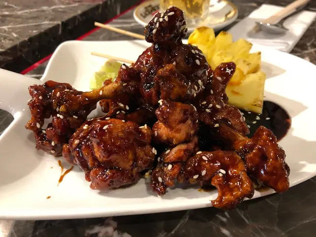 我女朋友被menu黑醋雞花球個張相深深吸引住,結果就叫左個黎試。上菜嗰陣已經聞到好大陣黑醋酸甜味,令人食慾大增,非常醒胃,食落舊雞啖啖肉之餘仲要外脆內嫩,唔錯唔錯。 伴碟仲有兩大串清甜既菠蘿,真係一道唔錯既開胃菜。
