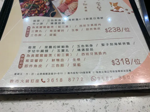 晚市,有兩款任食套餐可以選擇,豐儉由人。菜式亦清楚列明,黑色項目只出一次,紅色就無限追加。