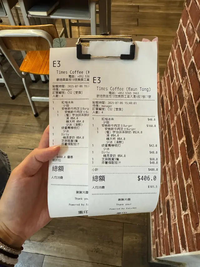 4個大人叫咗安格斯牛肉芝士漢堡、炸薯條(兩個小foodie搶住食)、芝麻雞翼,份量超足!另加4杯嘢飲,埋單都只係$406,即係人均$100有找!行到攰攰地過嚟hea 下都可以。