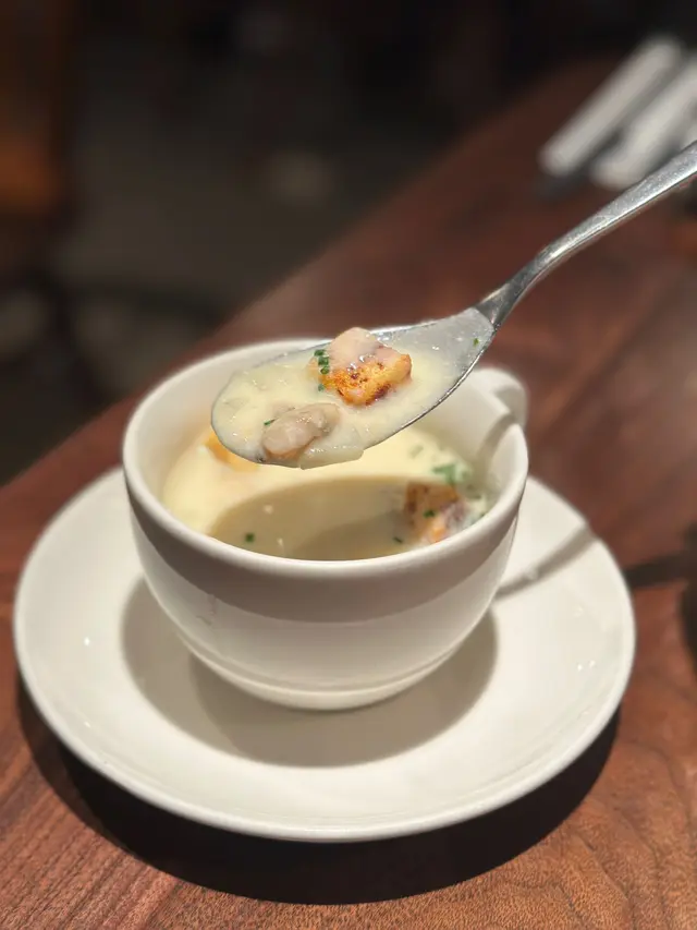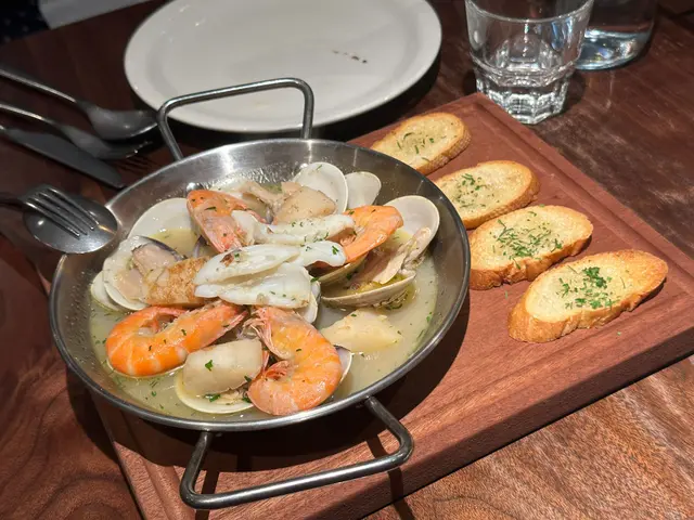 香草白酒煮海鮮拼盤配蒜香法包:海鮮種類繁多,有彈牙魷魚,鮮甜帶子,同埋經典大蜆大蝦。香草白酒汁吸收所有精華,配蒜香法包好正。
