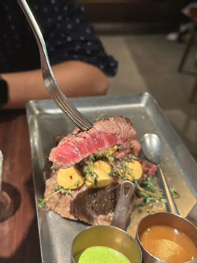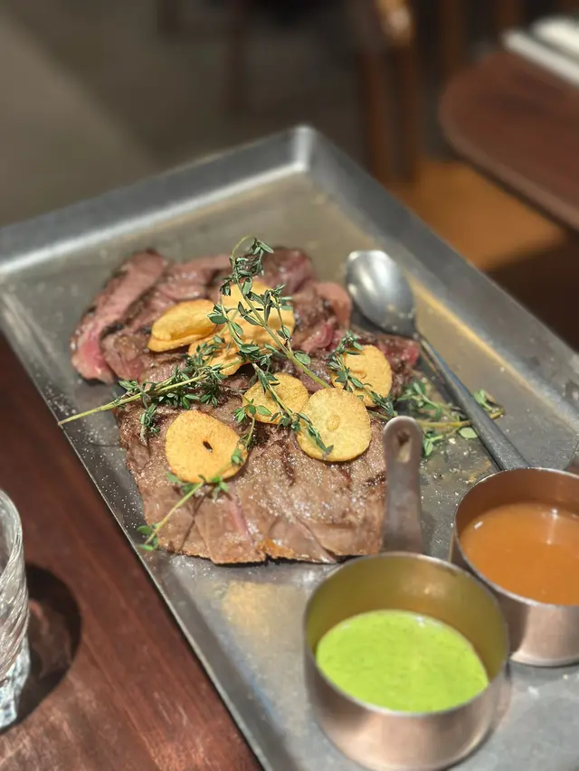 美國1855 安格斯肉眼(三成熟):係今晚的重頭戲,肉眼已經幫我地切好一片片,放係鐵板上面熱住超正。牛扒三成熟,入面微紅,外面微焦,香嫩可口,有少少咬口。入口牛味香濃,肥瘦適中,油滑好靚,輕輕加少少鹽,已經好正。仲有蒜香同青醬可以點,但簡簡單單已經好好食。