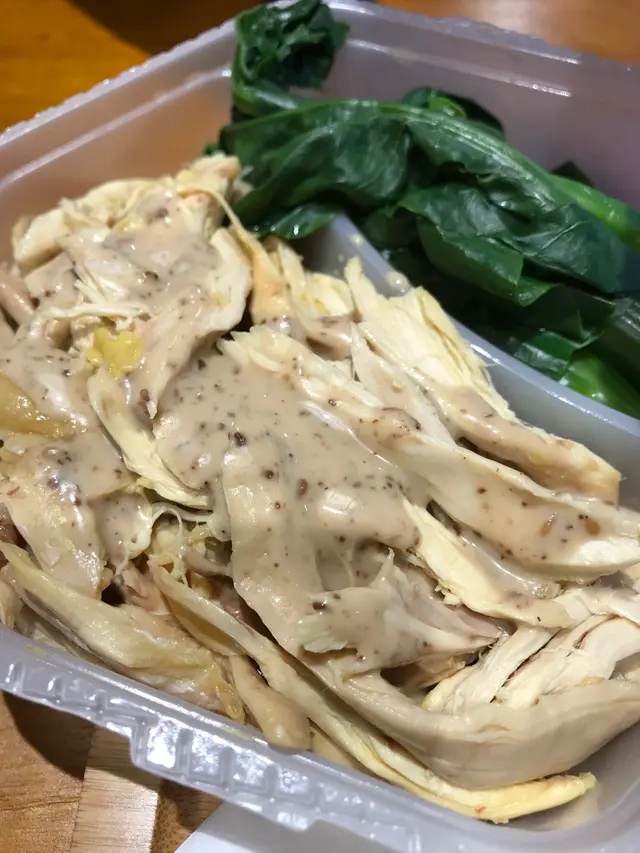 等左五分鐘左右,食物就到左手,莉莉子叫左日式麻醬手撕雞,份量都唔少,配上麻醬俾客人自行撈黎食。雞肉嫩滑唔鞋口,最正既係佢地會俾一壺湯杯你自己加,如果想買外賣食既,呢度非常岩你。