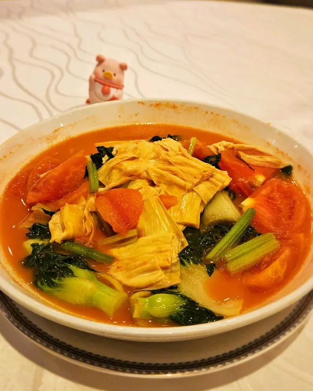 蕃茄湯底清甜帶微酸,非常開胃。腐竹同菜苗吸收哂蕃茄湯底味道,相當入味,整道菜式好有住家菜嘅感覺。