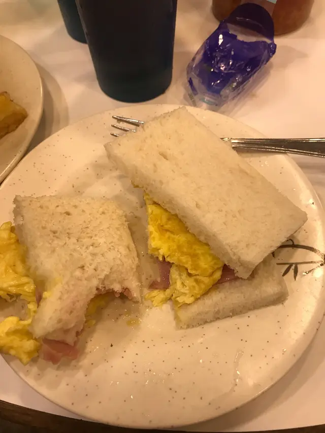30幾蚊。食物黎了,竟然係一份淨火腿三文治.........我都非常客氣地叫佢: 唔好意思,我係叫蛋腿治。