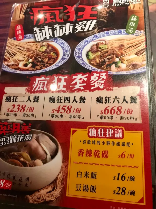 小編坐低後同朋友點左瘋狂二人餐($238),呢個餐有60串串串香,當中包括30串肉30串菜,味道揀左藤椒湯味,食落口亦有麻辣感,但對比麻辣湯無咁辣,唔食辣既人可以試下!