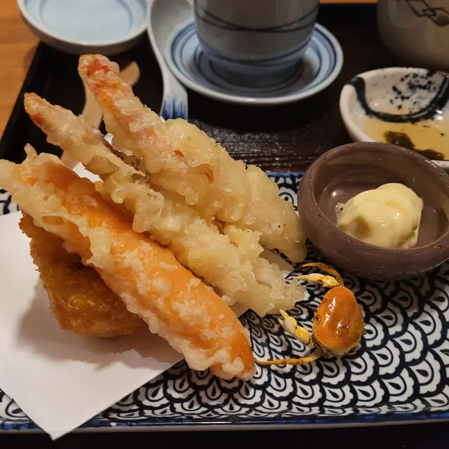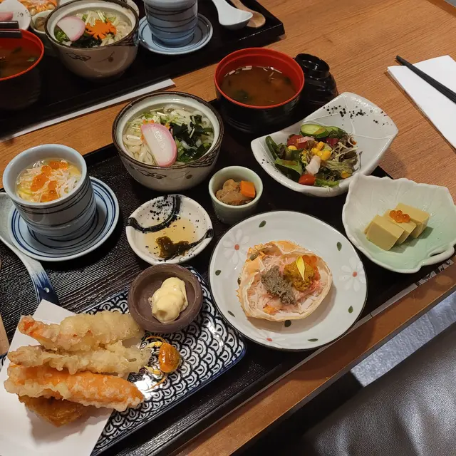 我地每人都叫左一個蟹御膳,入邊包括天婦羅蟹捧烏冬、蟹肉蒸蛋、蟹膏豆腐、忌廉蟹肉餅以及松葉蟹甲羅。