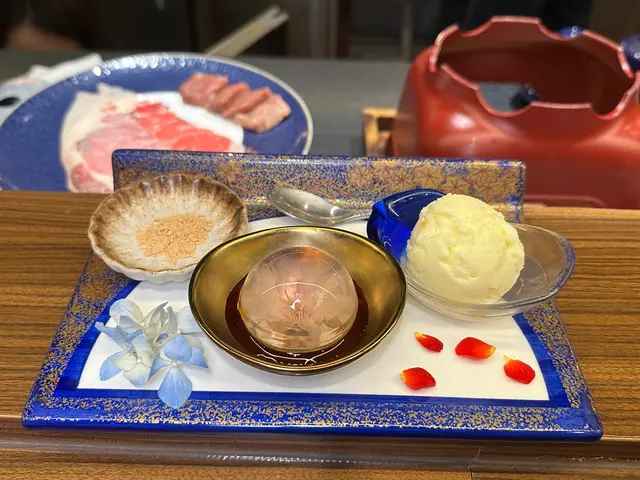 造型得精緻,是內有櫻花花瓣裝飾的水信玄餅,配有黑糖漿和黃豆粉,爽甜滑溜,雲呢拿雪糕冰凍可口,奶香而滑溜,香甜美味。