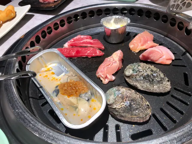 至於燒肉拼盤,呢度有齊牛、豬、雞,同埋海鮮。係咁多肉肉之中,我最鍾意Mozzarella芝士雞腿肉,肉質嫩嫩的雞肉,點錫紙兜內的溶芝士,真係好惹味。另外,兩隻鮑魚都幾大隻,而且超級厚肉,食落爽口彈牙。比目魚西京燒燒完仲係好滑溜,本身唔多鍾意食魚的我都忍唔住再點多次。本身以為韓風瓷壺醬油牛肋肉會好辣,驚我未必食到。點知入口唔辣,而且炆得好淋身,而且啖啖肉。