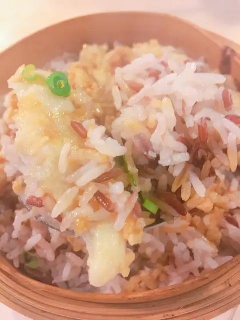 荷香蒜蓉海班片原籠蒸鴛鴦飯 - 份量絶對夠二人分享, 海班片啖啖肉食得方便, 蒜香味入晒落魚肉; 而個紅米及白米煮成嘅鴛鴦飯, 軟硬度岩我胃口, 又有少少荷香, 幾吸引!