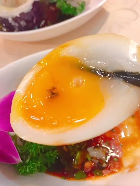 呢客茶燻流心蛋伴黑魚子醬配厚切茄子, 不單外型靚, 流心蛋呈流心狀態, 蛋黃汁味濃; 下面個厚切茄子先油泡, 外脆內軟, 最緊要係個黑魚子醬汁, 濃味惹味, 夾無味茄子就加添好多分數!