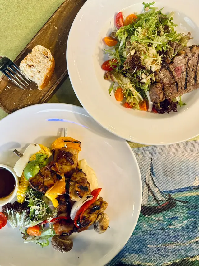 烤雞串係巨型版本,一串烤雞串有兩大件烤雞🐥、彩椒🫑、洋蔥🧅同蘑菇粒🍄🟫,件件份量好大粒,全部都烤焗過好香,有肉有菜,伴菜仲有粟米同薯蓉,五色蔬菜,營養價值豐富!