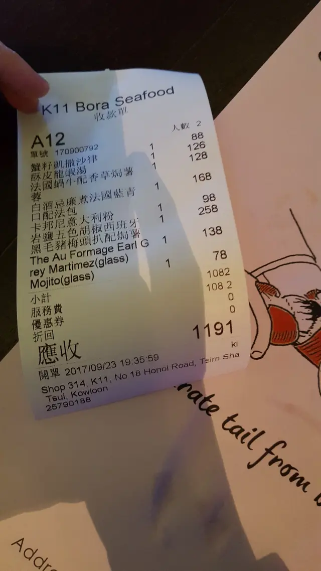 位於K11 3樓的baby k Bora Seafood,一開始察覺唔到它的存在,畢竟是該樓層最入的一間餐廳。但行過去,見價錢合理又係我喜歡的西餐,無需考慮就與男友決定入去食。
