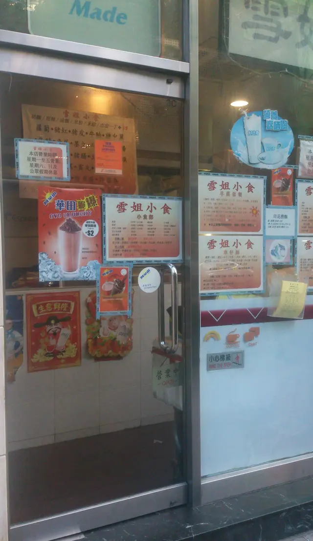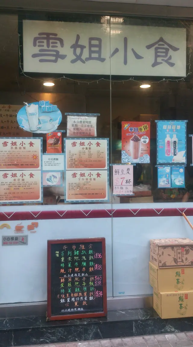 餐牌放在門口。雪姐屬於「外賣店」,小小的店鋪,不設座位。而店員都是老年,上了年紀的,感覺似是老「拍檔」做小生意。