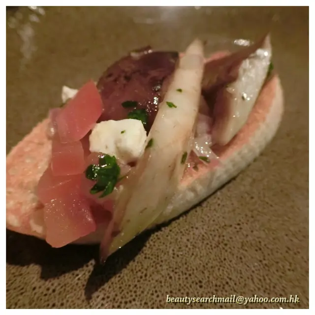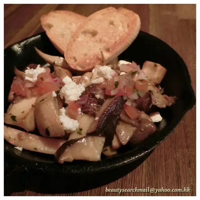 以鐵板而上的「香蒜炒野菌伴希臘芝士」,上桌時熱烘烘的,鐵板上伴有兩片蒜蓉包,主角是數款野菌類,但小篇對野菌認識不深,未能一一介紹。另外還有蕃茄粒及來自希臘的芝士粒,混搭出田園的清新味道,唯只有數粒軟芝士,份量較少,芝味亦未夠濃郁。