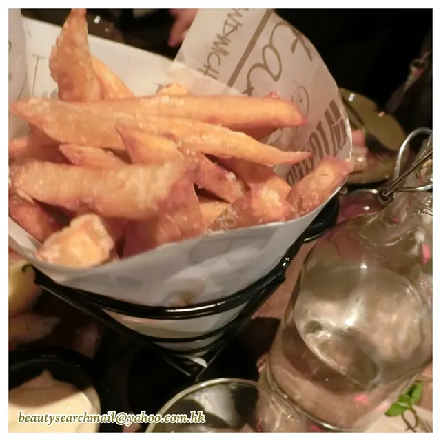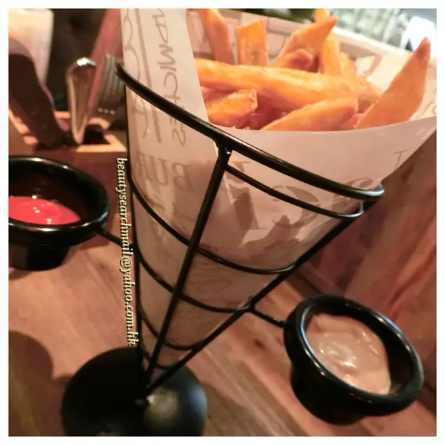 炸薯條吃得多,但「炸蕃薯條」真的不是到處可品嚐,難得這裡可以點選,當然不會錯過。上桌時,一個巨型的雪糕筒型,放滿了炸得脆口的蕃薯條,左右兩邊,還伴著蕃茄汁及?沙律醬。不過,蕃薯味道香甜,其實不蘸任何醬汁也覺非常味美。